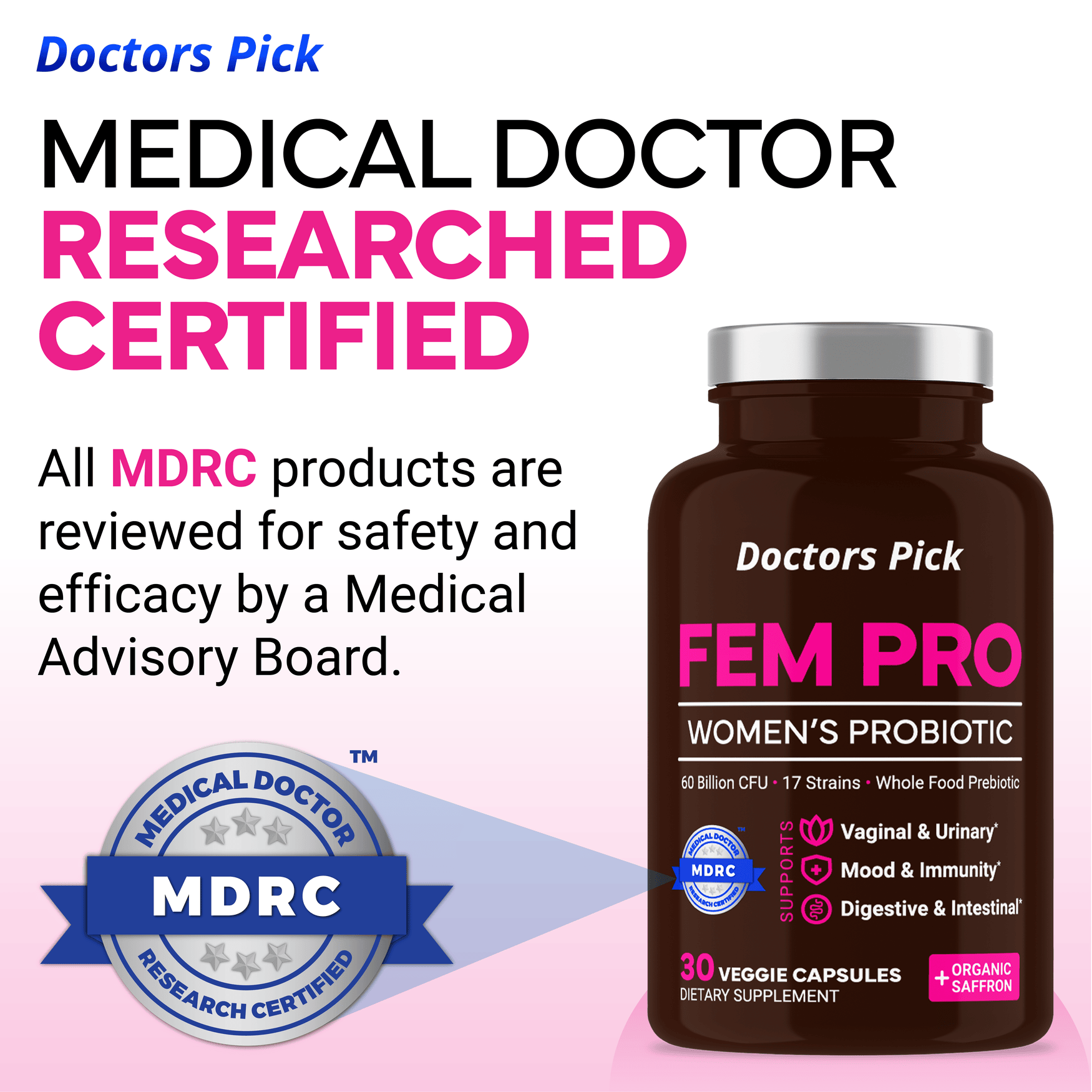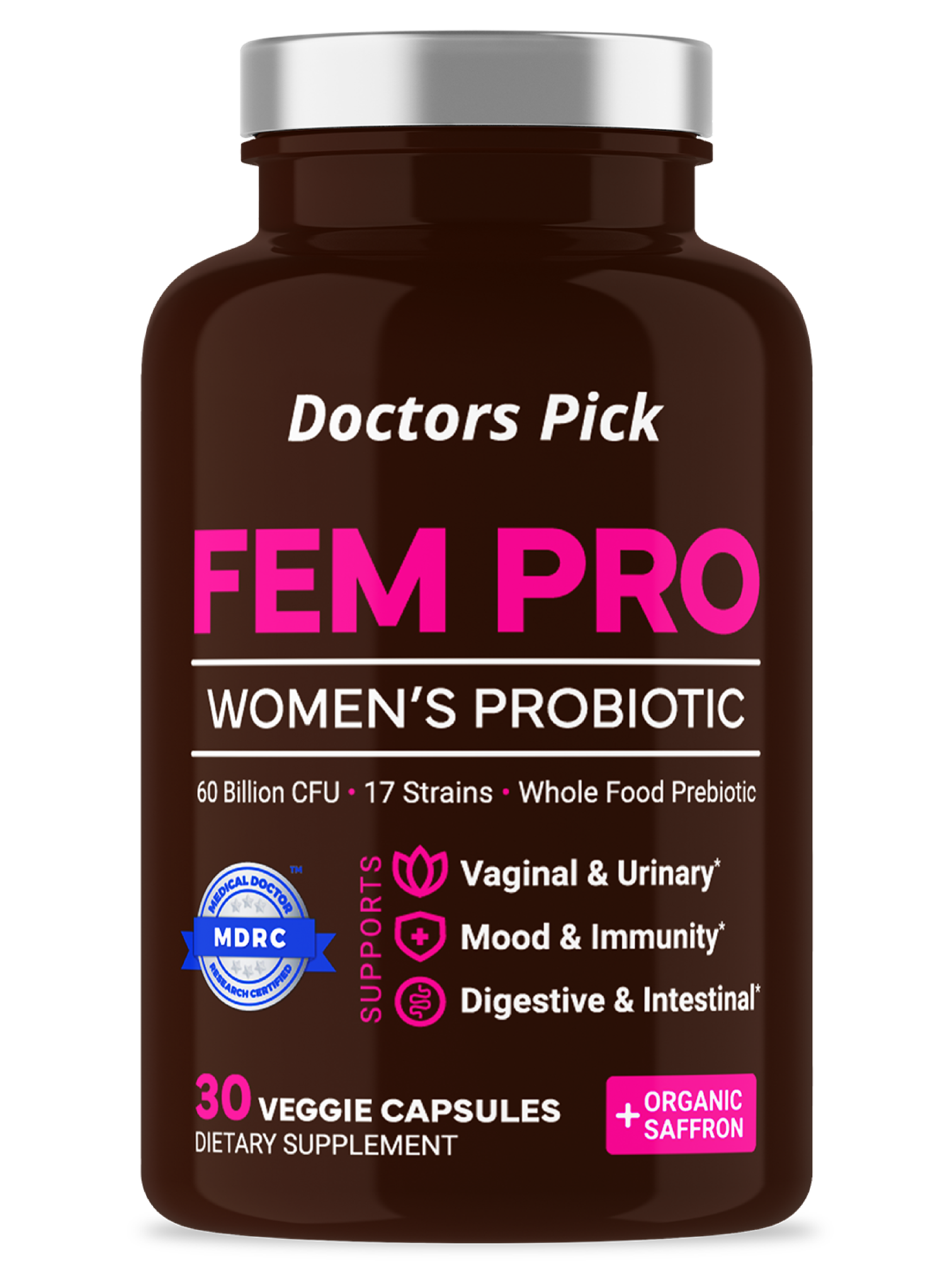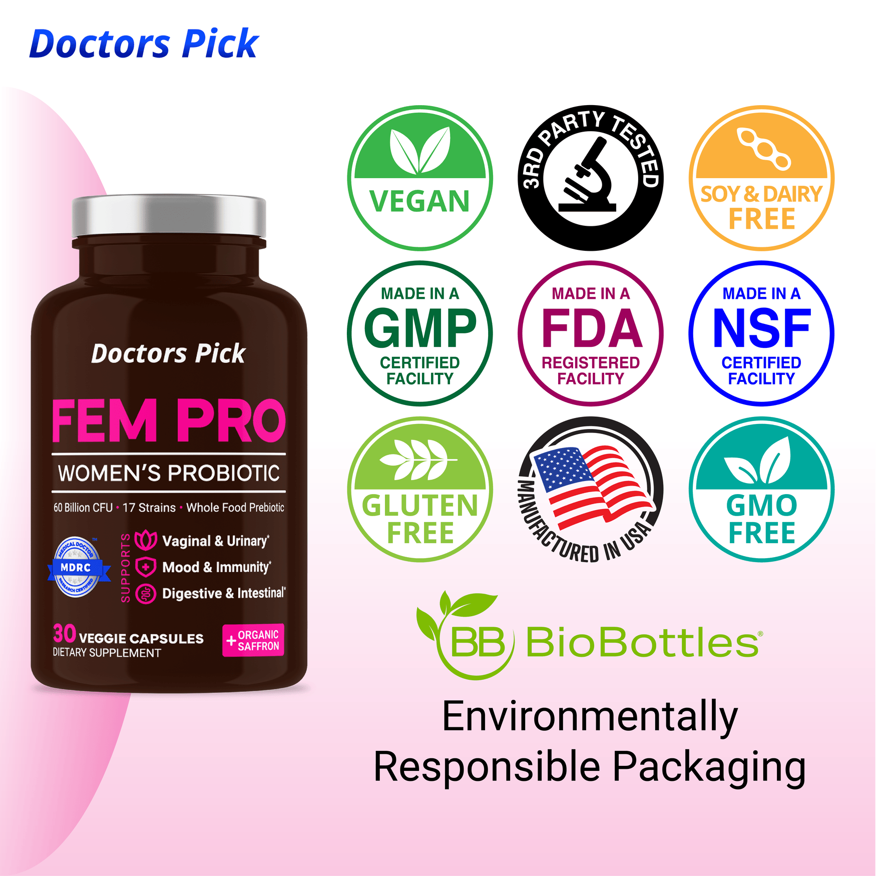 I was diagnosed with A/Fib a year ago and have to take a few medications for the rest of my life . These medications have caused me so much discomfort with my gut, digestive tract, constipation and female infections. I researched probiotics in desperate need of help . I learned that there are 4 major things to look for in a probiotic. Purity with no fillers, storage bottle that keeps the probiotics cultures active longer ,third party testing and money back guarantee. I reached out to Doctors Pick several times on there sites e-mail with many questions after my research and I received a response the very next day . They answered all of my questions and was extremely knowledgeable. I decided to order a 3 month supply thinking I would know if Fem Pro was going to help . Well after 2 weeks I started to feel better and by the end of the first month ALL of my discomfort and symptoms were Completely gone . I even had to complete a 10 day supply of antibiotics which always gives me stomach and female issues and for the first time EVER I had NO issues at all . Thank god I found Fem Pro Probiotics and can live a life without feeling awful every day . The company is fantastic, extremely helpful and the products are all researched, tested and made from the purest ingredients available. I will be taking Doctors Pick Fem Pro for the rest of my life . This is one very happy customer. I would give a 10 star rating if I could .